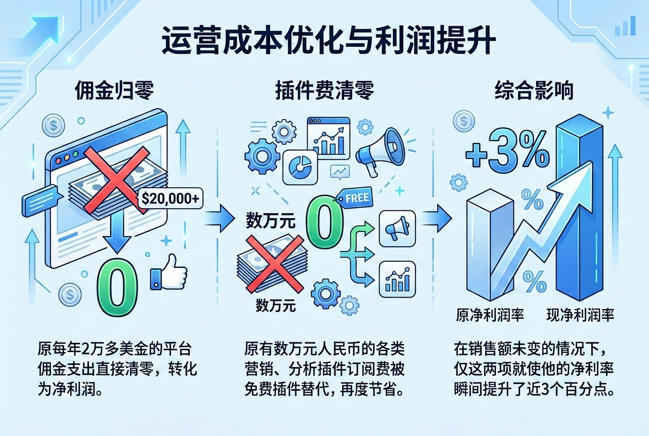 - 佣金归零:原每年2万多美金的平台佣金支出直接清零,转化为净利润。