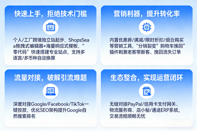 快速上手,拒绝技术门槛: 无论你是个人想做跨境独立站,还是工厂做跨境独立站怎么起步,顺店ShopsSea的拖拽式编辑器和海量响应式模板,让你“零代码”也能快速搭建专业站点。支持多语言独立站和多币种独立站自动换算,轻松应对全球市场。