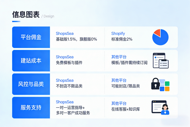 平台佣金: 这是最直接的“硬成本”。顺店ShopsSea的基础版佣金仅为1.5%,而其付费套餐(如旗舰版)佣金可低至0。相比之下,Shopify等平台的标准佣金通常在2%左右,对于利润本就微薄的卖家而言,这笔长期支出差异巨大。